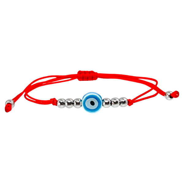 Pulsera de hilo y acero quirúrgico - Rojo - Ojito de ceramica - Celeste